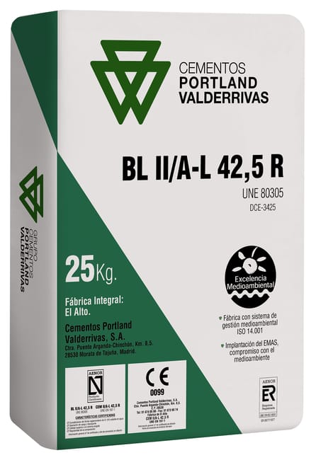 Cemento portland blanco con caliza, tipo BL II/A-L de resistencia 42,5 MPa a 28 días con resistencia inicial elevada R. Apto para uso en interior y exterior e indicado para la fabricación de morteros y hormigón.